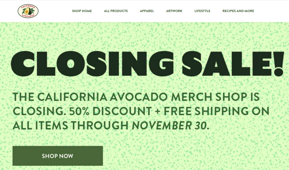 The California Avocado Merchandise Shop is closing! Place your order today before its too late! The last day that orders can be placed on Shop.CaliforniaAvocado.com will be November 30, 2022. A special “Closing Sale” offering 50% off the regular price of all merchandise plus free shipping will begin on November 16 and continue through November 30. This is an excellent opportunity – and the last chance – to buy California avocado hats, t-shirts, hoodies and other apparel as well as other items such as the popular Avo Head Hat, beach towels, posters, tote bags, coffee mugs and more. Orders will be taken on a first come first served basis, and once an item sells out no other orders for that item will be accepted. So don’t wait, take advantage of this one-time promotion to buy holiday gifts, office décor and something for yourself by placing an order now. No promotion code is needed.