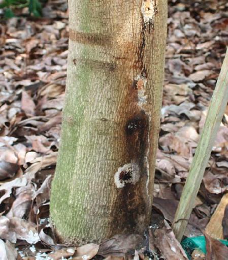 Phytophthora mengei (P. citricola) and P. cinnamomi have been associated with trunk canker and collar rot of avocado. The pathogen infects the crown, lower trunk and limbs of older trees. The disease develops after crowns, limbs, or trunks become infected through wounds, such as injuries from equipment, pruning, vertebrate chewing, and wind damage. Spore spread and disease development are favored by excess soil moisture and wet conditions. Contaminated equipment and tools that wound healthy trees can cause a new infection. The pathogens also cause avocado fruit rot.