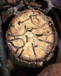 - Removal of the bark from wilted branch section exposes black to brown streaks of discoloration extended into the adjacent wood.
