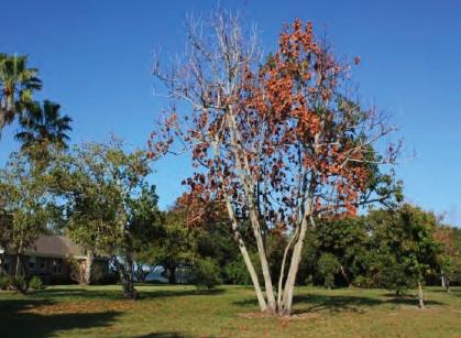 - Trees with laurel wilt show various stages of crown decline, including branch dieback and occasionally defoliation with reddish and purple discoloration.