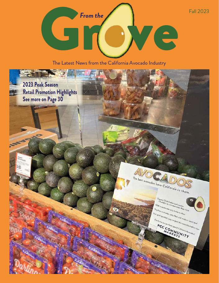 Image In This Issue Chair's Report Fall 2023 Commission Appoints Government Affairs Taskforce The Splane Perspective New Entomology Advisor Joins UCANR CA Grown Partnership Generates More Than 46 Million Impressions Research Trial Report: Safety and Efficacy of Herbicides in Bearing Avocados Fall 2023 Foodservice Mid-Late Season Promotions 2023 Peak Season Retail Promotion Highlights Fall 2023 Recipes World Avocado Market Projection up to 2030 Handlers' Report - Difficult Season Had Ups and Downs SubscribeCalifornia avocado industry members interested in subscribing to From the Grove should contact April Aymami, CAC Industry Affairs DirectorContact April
