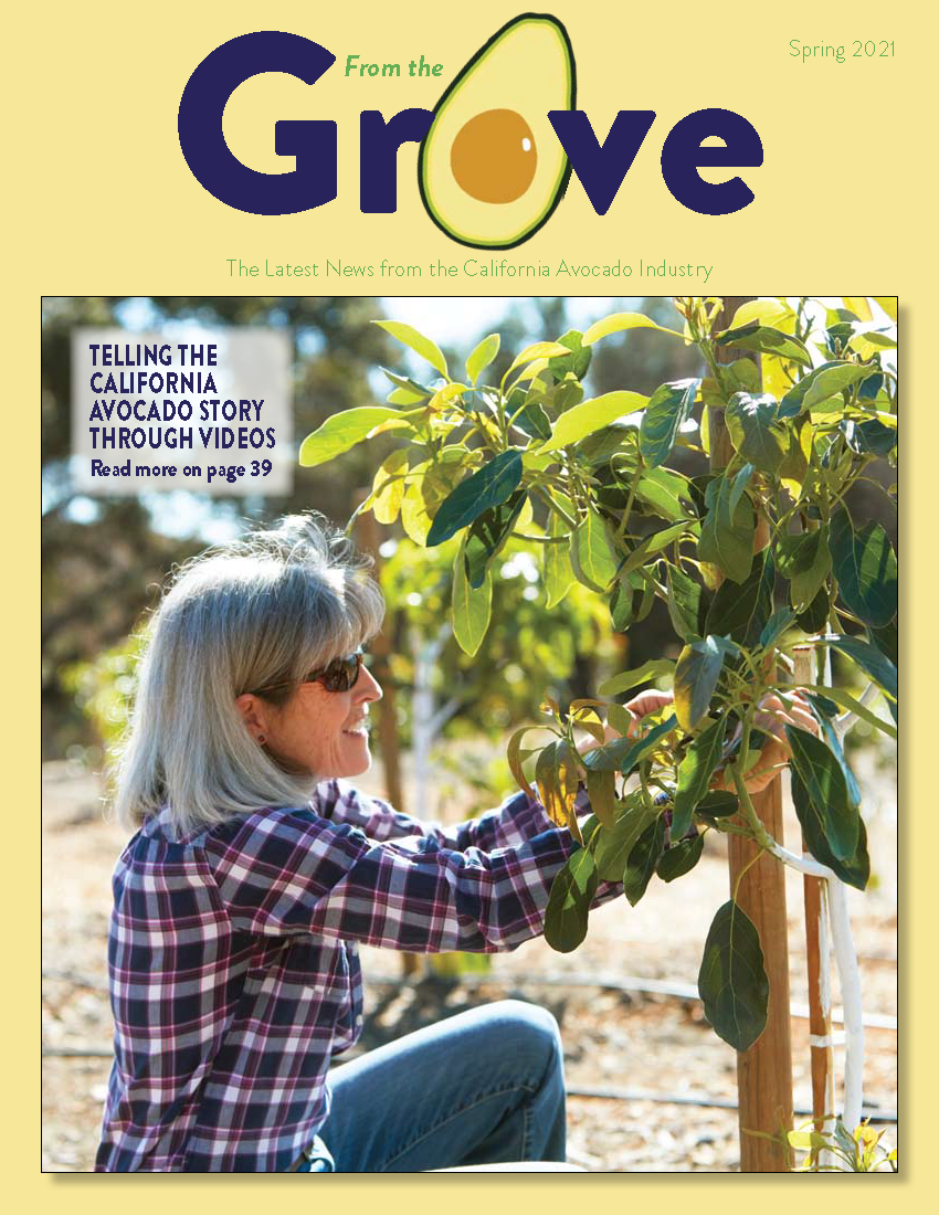 Image In This Issue California Avocados Perform Well Despite Tumultuous Year Reaching Targeted Consumers Through Creative Media and Social Avocado Establishment & Production Costs & Profitability Analysis in High Density Plantings Telling the California Avocado Story Through Videos Commission Highlights Environmental Contributions of California Avocado Groves USDA Announces Pandemic Assistance for Producers Program Smaller Crop Should Produce Better Pricing The Latest on Laurel Wilt CAC Releases Updated 2021 Crop Volume and Harvest Projections Message from the President Avocados Help Diversify Mellano & Co. 2020 California Avocado Tracking Study Highlights GEM Avocado Fruit Scarring Causes and Preventive Measures Introducing the New California Avocado Consumer Ad Campaign 2020 California Avocado Acreage Update Statewide Grower Referendum Affirms Continuation of California Avocado Commission Chairman's Report SubscribeCalifornia avocado industry members interested in subscribing to From the Grove should contact April Aymami, CAC Industry Affairs DirectorContact April