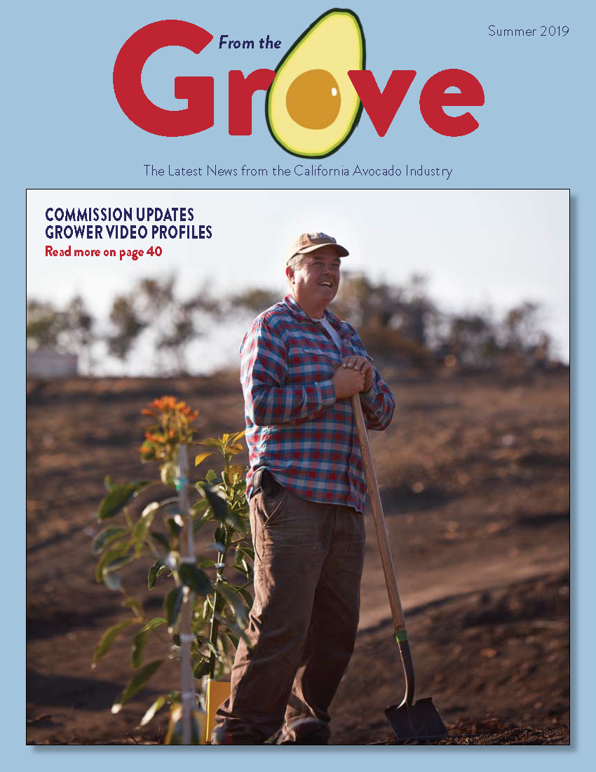 Image In This Issue Message from the President Chairman's Report CAC Hosts Regulatory Officials On Grove Tour 2019 Mid-Season Crop Update: Results of Grower and Handler Crop Surveys Gelson's Extends Avocados Beyond Produce Department Online Location-Based Marketing Spotlights California Avocado Availability Avocado Weed Management Grower Profile: Bryce & Elaine Bannatyne Take Circuitous Route to their Newest Passion Form I-9: Know the Requirements It's Not Just Water, It's Salt Understanding Plant Mineral Nutrition Annual Meeting Reflects on 40th Anniversary and Forges Ahead CAC Kicks Off Season With Targeted Activities Commission Updates Grower Video Profiles Hass Avocado Production Prospects: Managing World Production Growth Strong Field Price Quickly Moves California Crop SubscribeCalifornia avocado industry members interested in subscribing to From the Grove should contact April Aymami, CAC Industry Affairs DirectorContact April